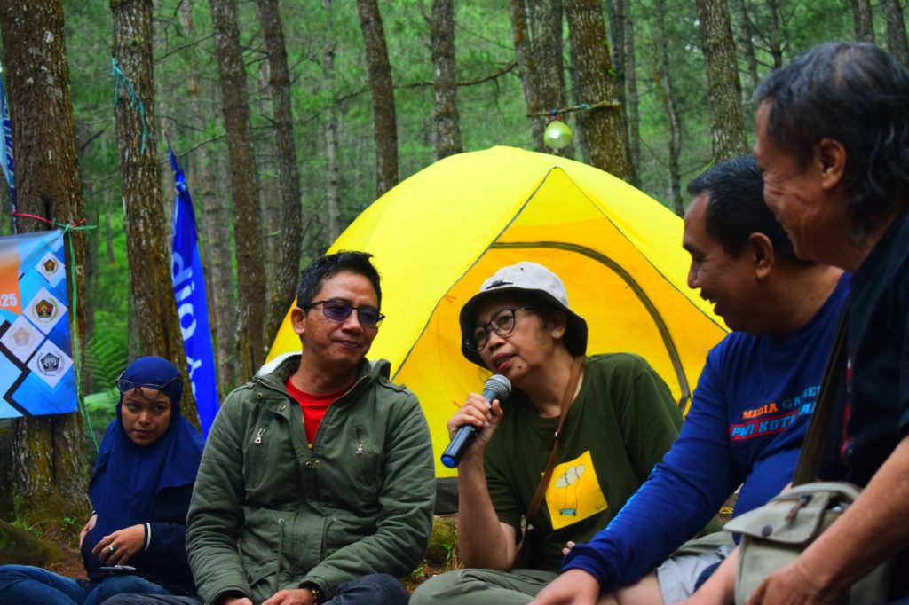 Diskusi berlangsung di area depan perkemahan dengan suasana hutan yang masih asri dan sejuk dikelilingi pohon pinus, sehingga menghadirkan suasana santai namun tetap substantif.